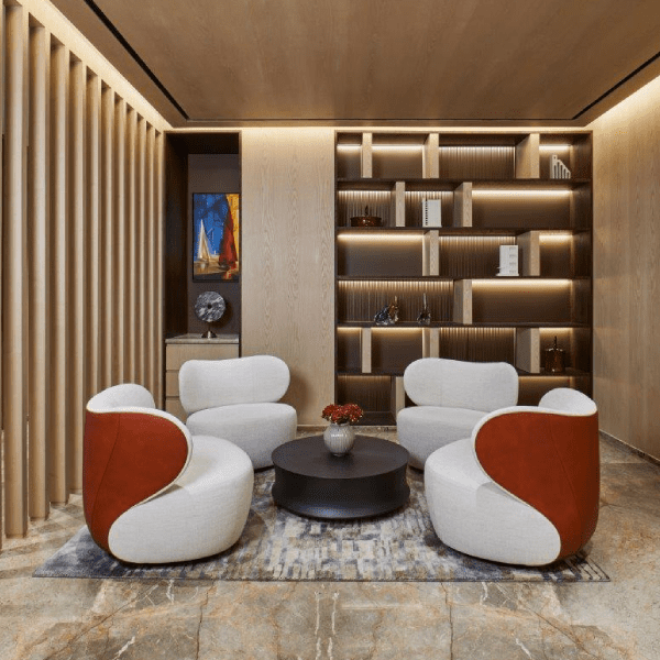Indradhanush also embraces personalisation, with art and artefacts adorning the space. These elements add a touch of individuality and creativity, enhancing the overall ambience of the workspace. It is a captivating project that leaves a lasting impression, blending craftsmanship, attention to detail, and functionality in a visually stunning manner.
