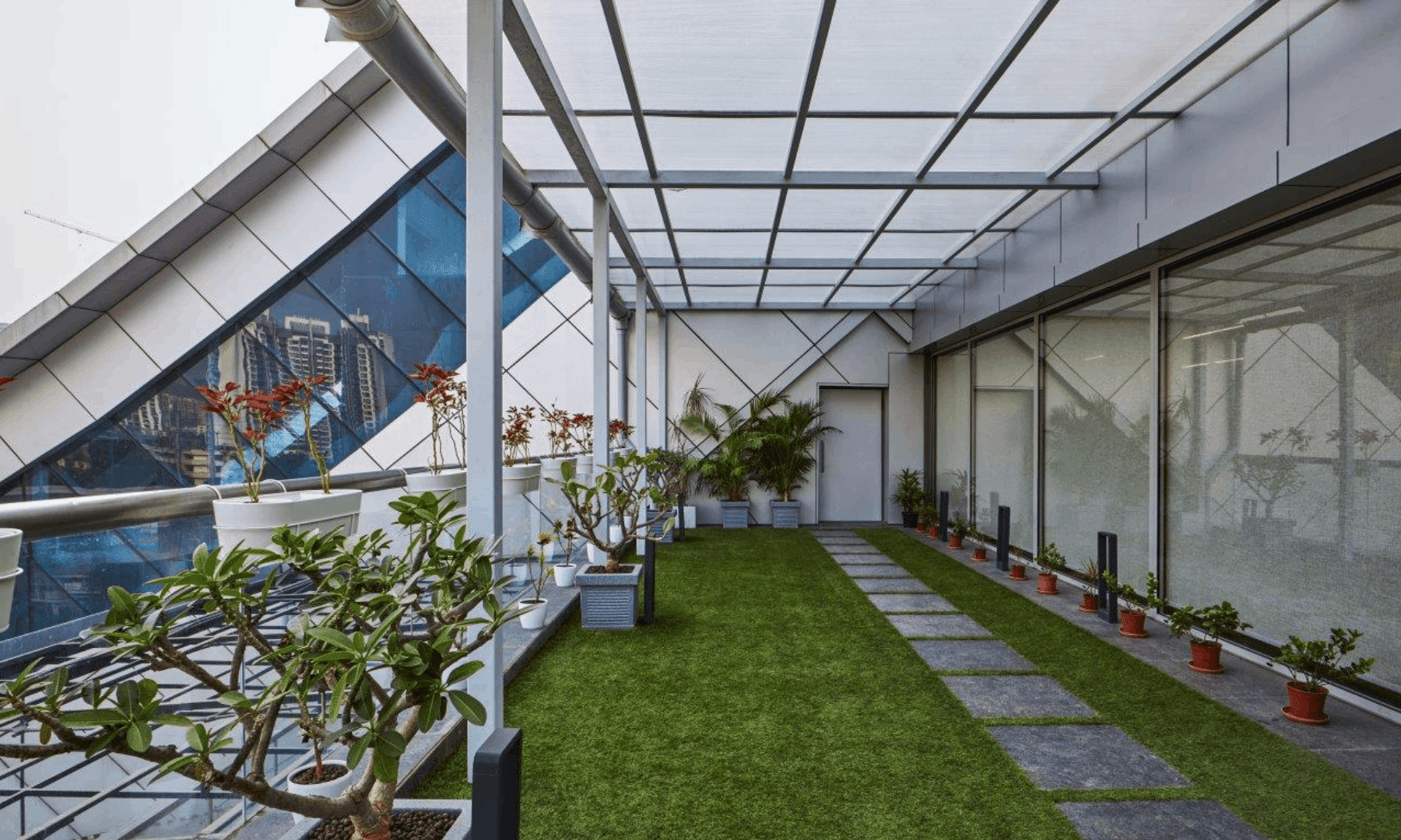 Indradhanush is an awe-inspiring architectural project that seamlessly combines design and functionality. This remarkable workspace is featured in Architectural Digest. The spatial planning follows a linear geometry, ensuring a seamless flow throughout the workspace. This design approach reflects a commitment to simplicity and efficiency.