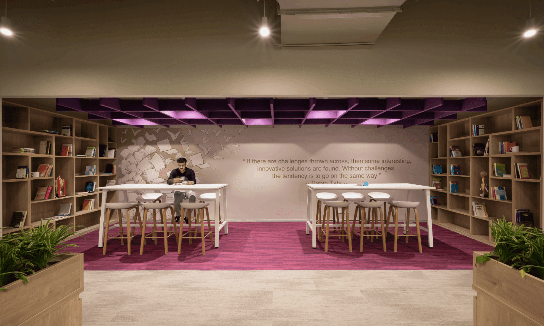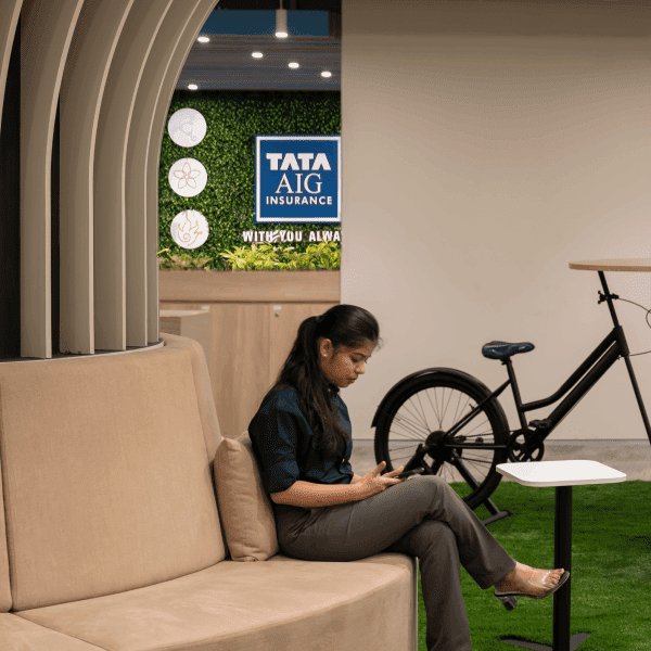 Experience a sustainable and nurturing workspace designed by JTCPL Designs for TATA AIG, where protection and well-being thrive.