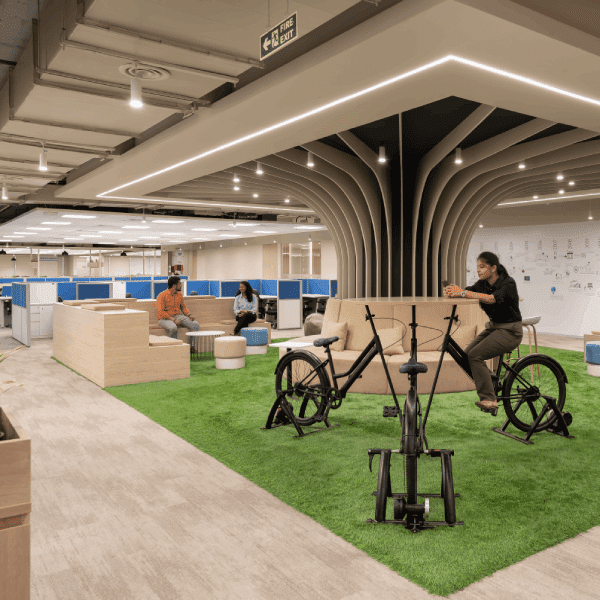 The office boasts open and airy spaces, spacious aisles, and interconnected circulation areas that encourage collaboration and well-being. Vibrant colours, bean bags, cycles, and an amphitheatre add a lively touch, appealing to young and dynamic talent. Completed in just 60 days, this new workspace provides TATA AIG’s team with a comfortable and homely environment.